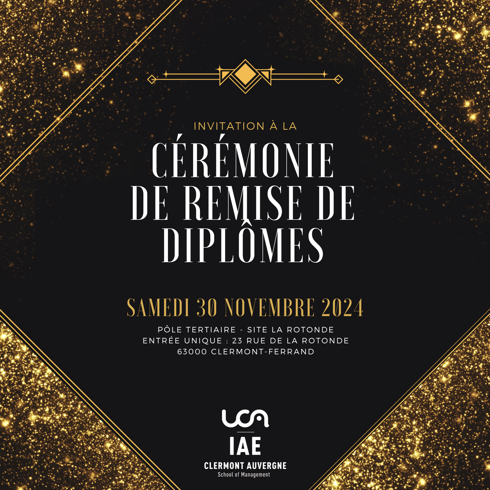La cérémonie annuelle de remise de diplômes pour les diplômés de Master et de Licence Professionnelle se déroulera le samedi 30 novembre 2024 au Pôle Tertiaire - site Rotonde, entrée unique 23 rue de la rotonde !
