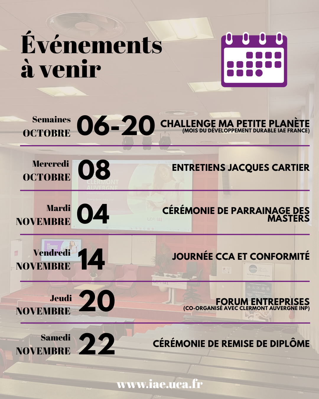 Voici les événements à venir pour le premier trimestre 2025-2026 à l'IAE Clermont Auvergne