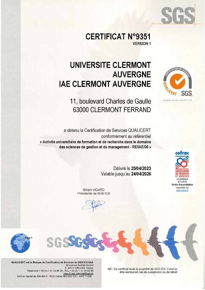 The IAE Clermont Auvergne, a member of the IAE Network, has obtained QUALICERT certification.